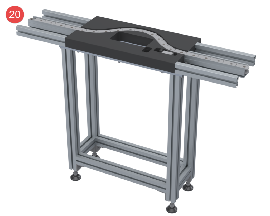 A robust plastic chain serves as a means of transport for the workpiece carriers, which are fed to the workplaces and stations according to the control sequence. The workpiece carriers are transported by friction between the sliding shoe and the chain. In the manual workstations or in front of the automatic stations, the workpiece carrier can be stopped by a stop module. Meanwhile, the chain transports the remaining workpiece carriers in the circuit. In the stations, the workpiece carrier is lifted from the chain by a centring module and precisely positioned.