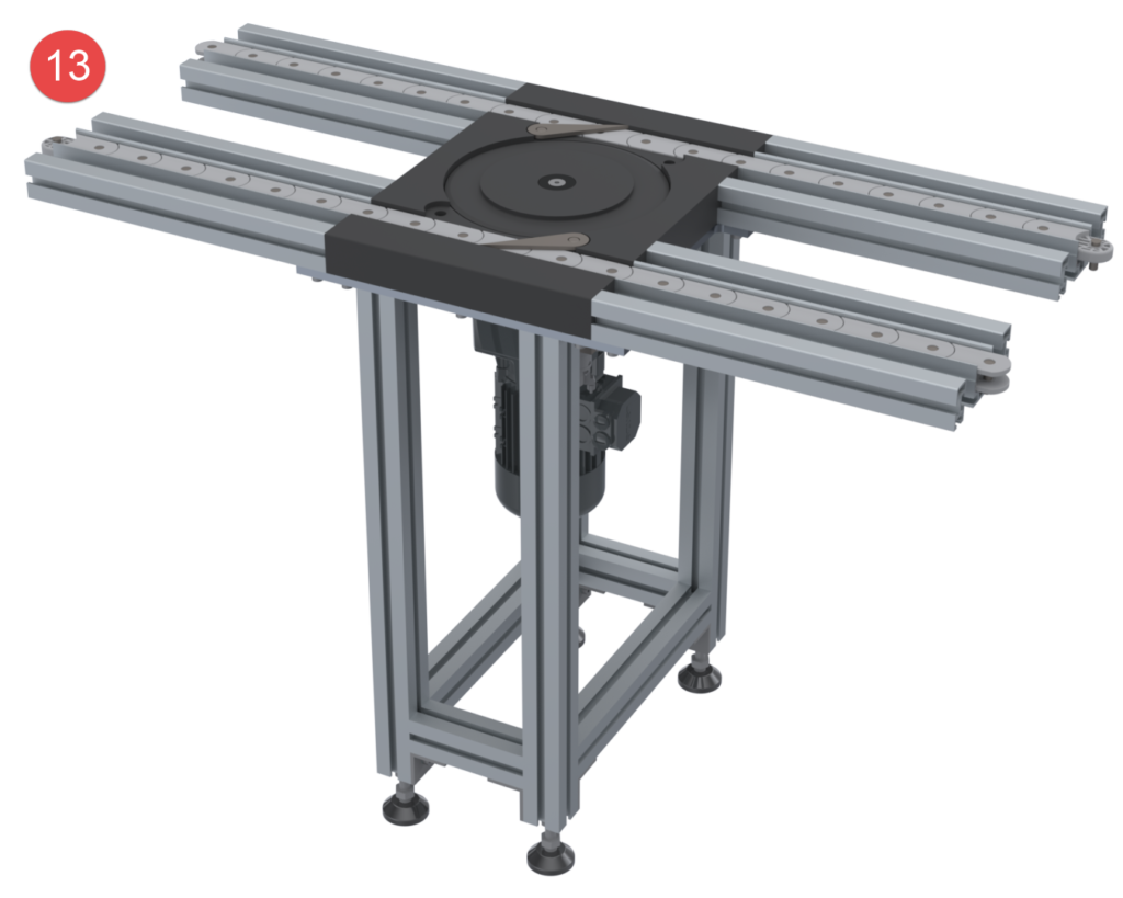 The transfer chain is guided through a chain wheel within a 90° or 180° deflection module. This is driven by a spur gear motor. Power is transmitted via the 10 mm steel pins in the chain links. A mechanical, adjustable slip clutch serves as overload protection and is specially adjusted for each drive system. The desired chain speed is achieved with appropriate gear ratios. The speed can be continuously adjusted within a range of ± 20% by means of a frequency converter.